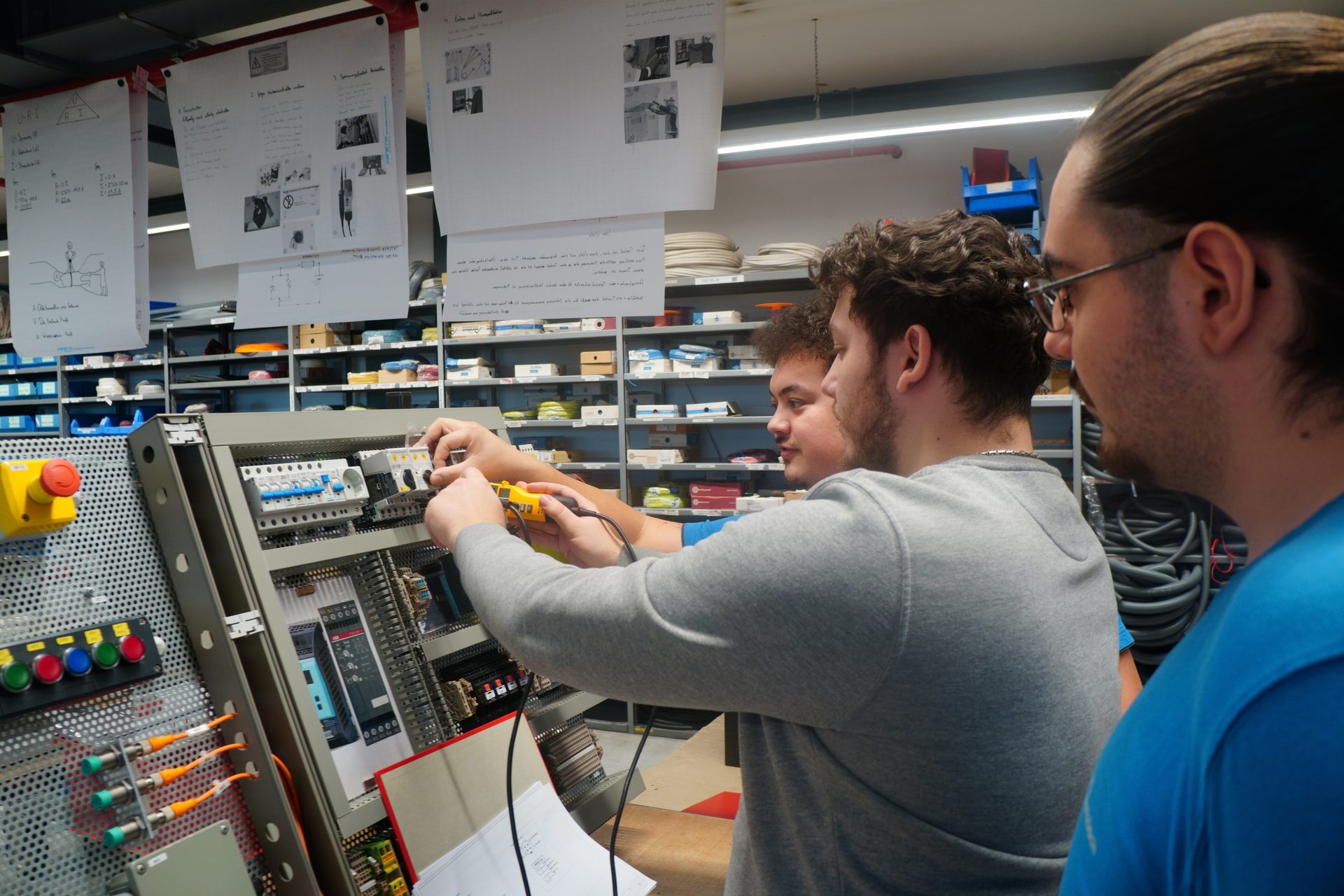 Drei Wochen dauert dann die intensive Vorbereitungsarbeit der Nachwuchsfachkräfte auf ihre Lehrabschlussprüfung. Während dieser Zeit werden sie vollständig aus dem Tagesgeschäft herausgenommen. So können sie sich auf die praktischen Inhalte der Prüfung vorbereiten. Dabei werden Sezer und Koray von mehreren Ausbildern unterstützt. Den Hauptteil übernimmt dabei Kevin Gassner, der die Lehrlinge insbesondere in den Bereichen Schaltungsaufbau, Messtechnik sowie bei den Grundlagen für speicherprogrammierbare Steuerungen intensiv vorbereitet.